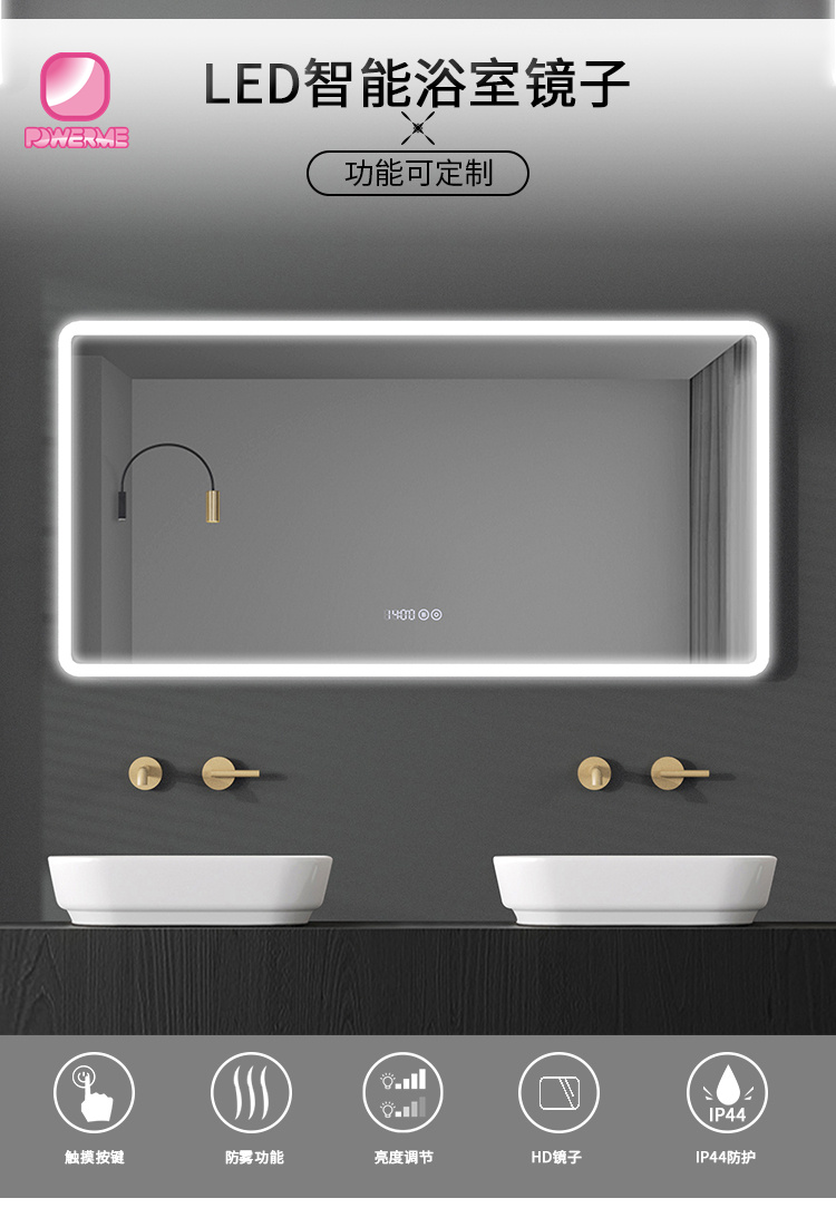 4.鏡面雙鍵觸摸帶時鐘開關,無極調節燈光亮度